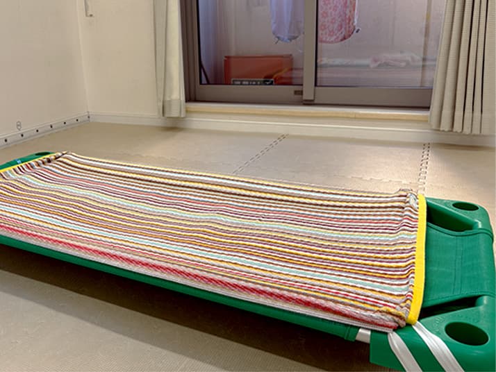 床面から離れた高さで午睡ができるコットを採用しています。ほこりや床からの冷えを避けられるため、衛生的で快適な睡眠環境を保てます。