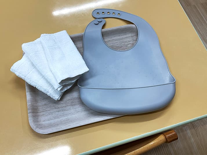 衣服の汚れを気にせず食事に集中でき、やわらかいタオルで口まわりや手など綺麗に拭き取ります。