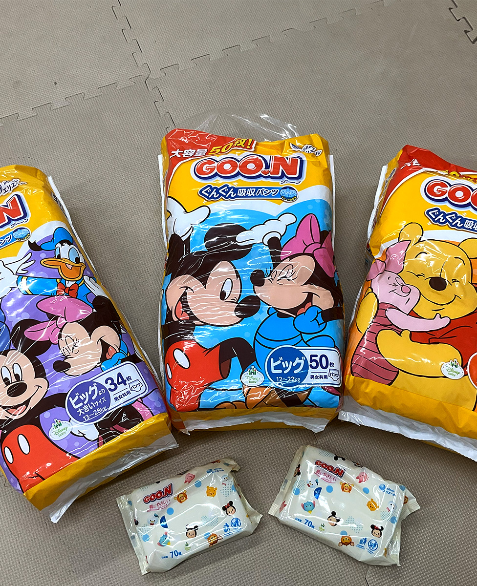 用品一覧の他に、おむつ・おむつ処理やお尻拭きなどご用意しております。