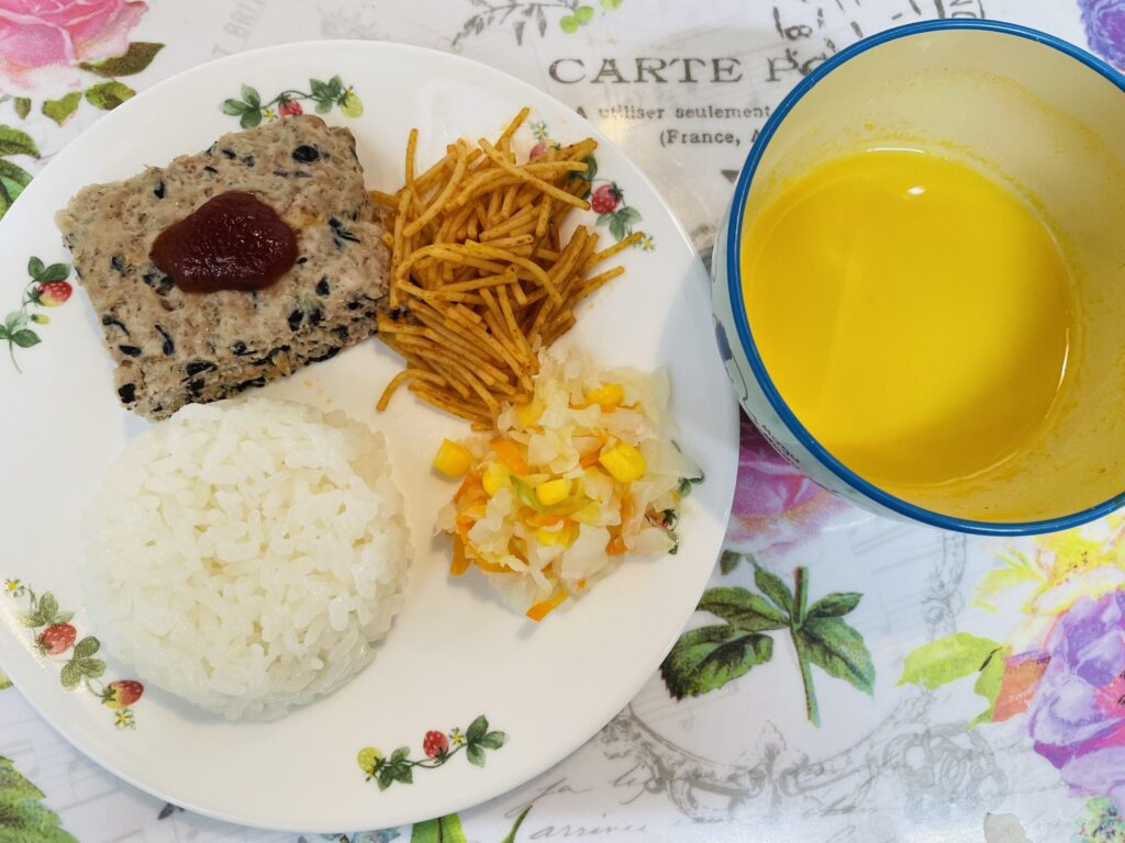 お楽しみ給食 ハンバーグ スパゲティソテー コールスローサラダ かぼちゃスープ 8月23日