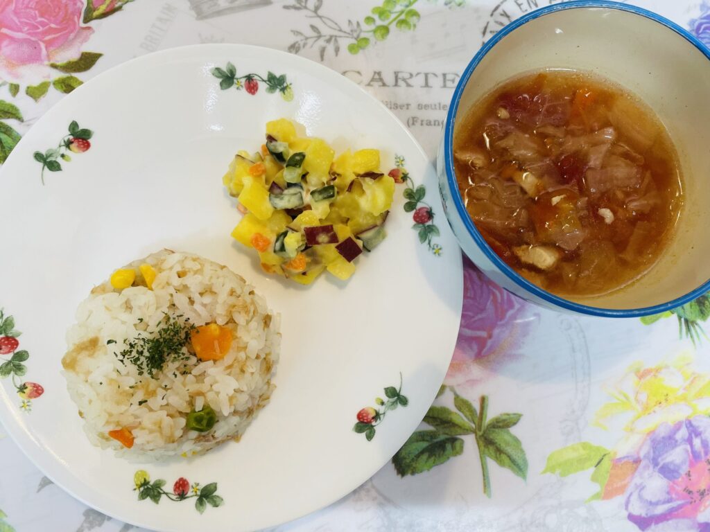 ツナピラフ マセドアンサラダ 鶏肉のトマトスープ 7月29日
