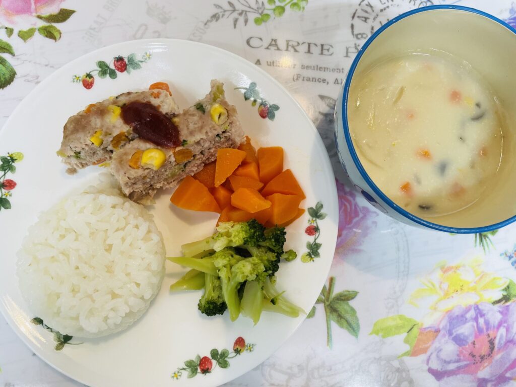 お楽しみ給食 ミートローフ 人参甘煮 ブロッコリーのスープ煮 豆乳スープ 10月25日