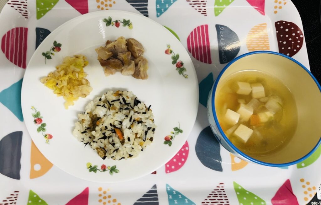 ひじきご飯 鶏の照り焼き 白菜のおかか和え けんちん汁 11月29日