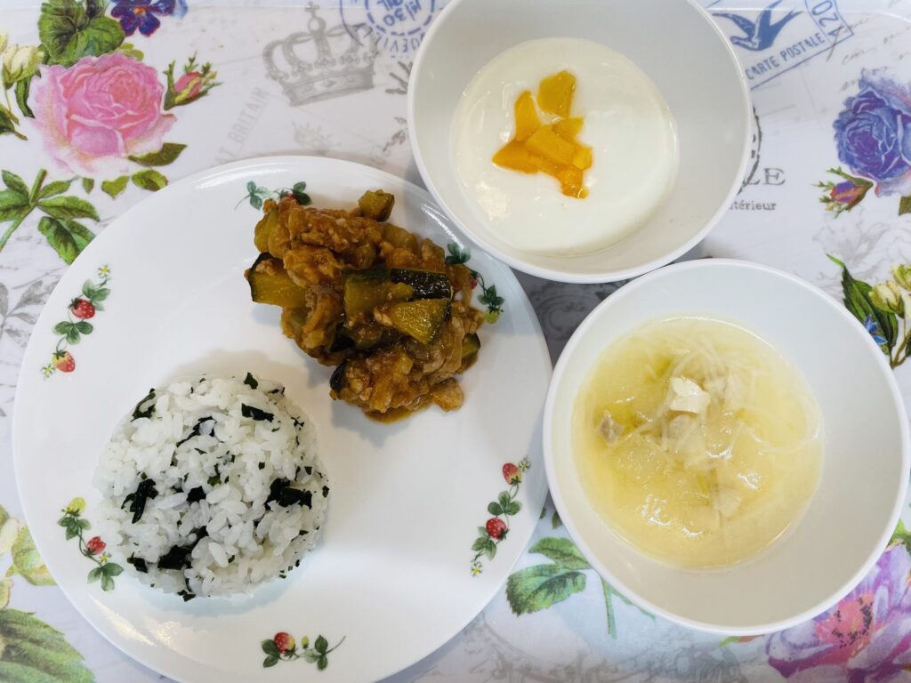 シラスわかめご飯 豚肉と夏野菜のトマト煮 鶏肉と冬瓜のスープ 7月31日