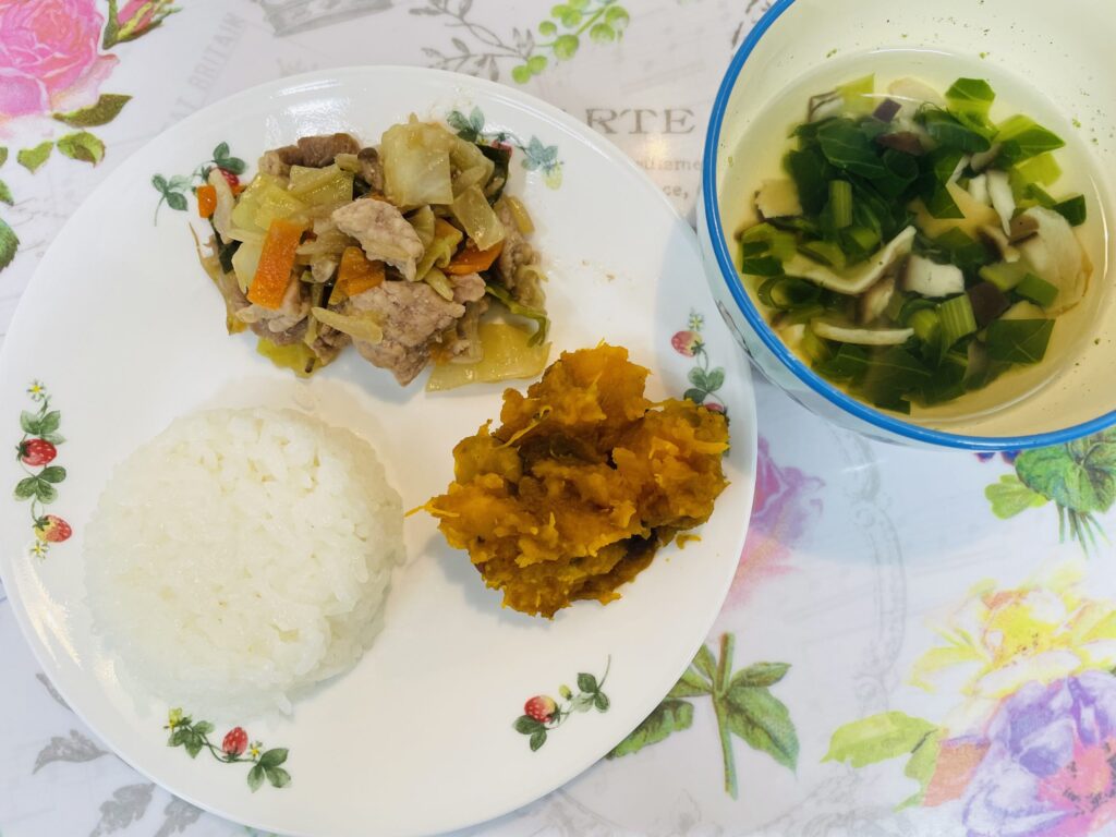 3. 肉野菜炒め かぼちゃのいとこ煮 4月5日