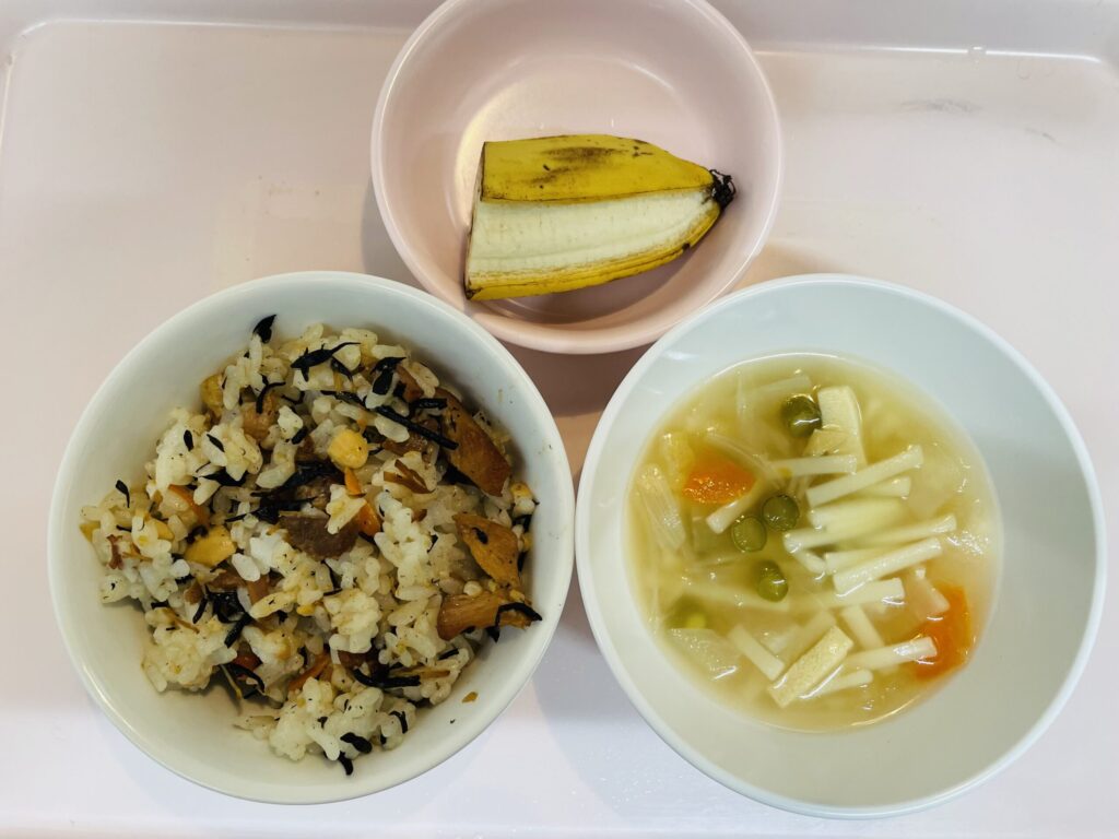 非常食給食 焼鳥缶使用炊き込みご飯 乾麺入りすいとん風汁 9月5日