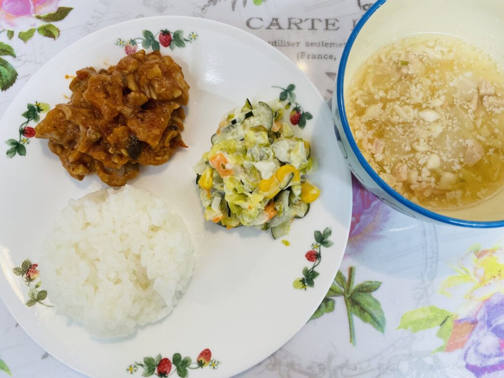 3. 鶏肉と大豆のトマト煮 春キャベツのサラダ 4月20日