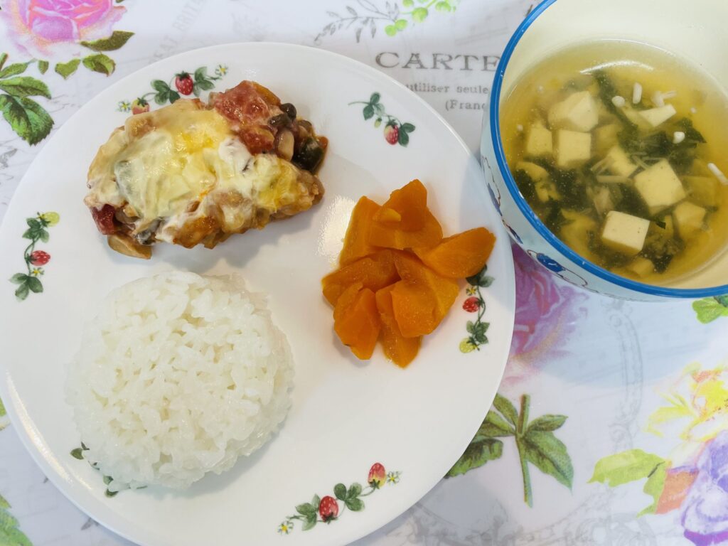 3. 鶏肉のトマトチーズ焼き 人参の甘煮 豆腐とモロヘイヤのスープ 8月24日