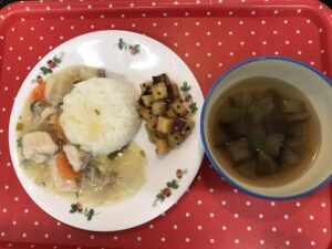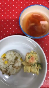 今日は初雪の降る寒い日でした❄️子どもたちは、ピラフもポテトサラダも大好きですが、スープはもっと好きです。今日のスープは魚肉ソーセージ入りのトマトスープ🍅たくさん食べてくれました。🥰
