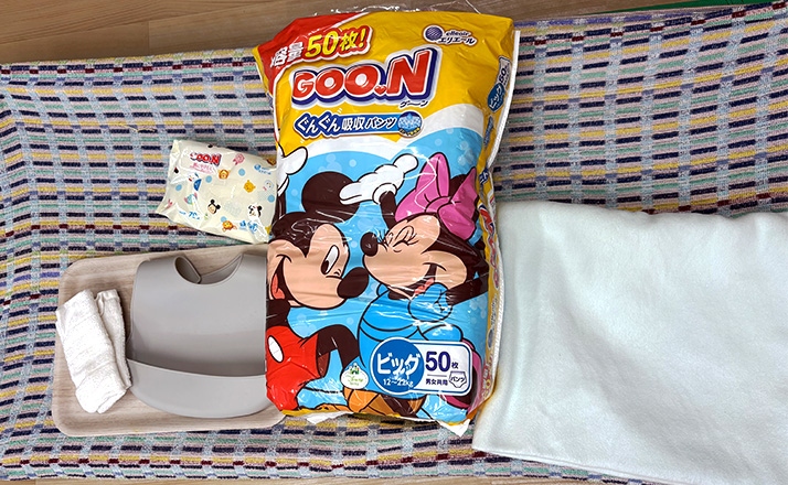 おはな保育園では、毎日の準備の負担を減らすために、おむつ・おしりふき・お昼寝布団・食事用エプロンなどを園でまとめてご用意しております。
